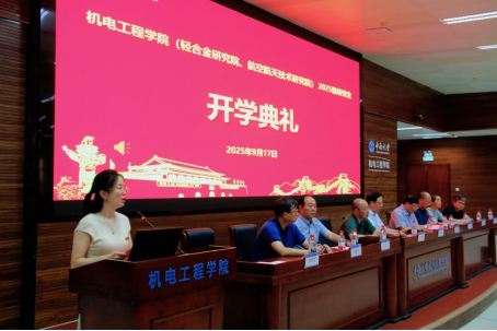 9月17日下午14:30,我院2025级研究生新生开学典礼在中铝科技大楼B214报告厅隆重举行。机电工程学院党委书记肖来荣、院长段吉安,航空航天技术研究院院长罗世彬,机电工程学院副院长蔺永诚、云忠、孙小燕,航空航天技术研究院副院长杏建军,轻合金研究院副院长张劲,以及各系所主任、导师代表和教务办公室教师、全体研究生辅导员出席本次典礼。典礼由学院党委副书记李玲芝主持。