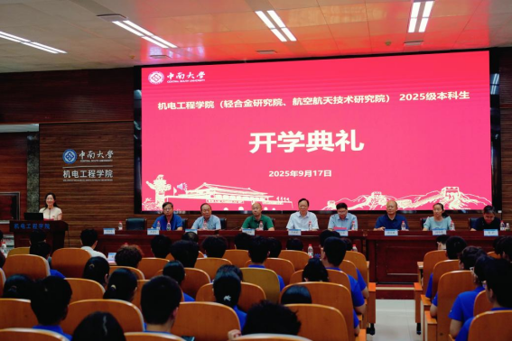 9月17日下午14:30,我院2025级研究生新生开学典礼在中铝科技大楼B214报告厅隆重举行。机电工程学院党委书记肖来荣、院长段吉安,航空航天技术研究院院长罗世彬,机电工程学院副院长蔺永诚、云忠、孙小燕,航空航天技术研究院副院长杏建军,轻合金研究院副院长张劲,以及各系所主任、导师代表和教务办公室教师、全体研究生辅导员出席本次典礼。典礼由学院党委副书记李玲芝主持。 典礼在庄严的国歌声中拉开序幕。老生代表2022级博...