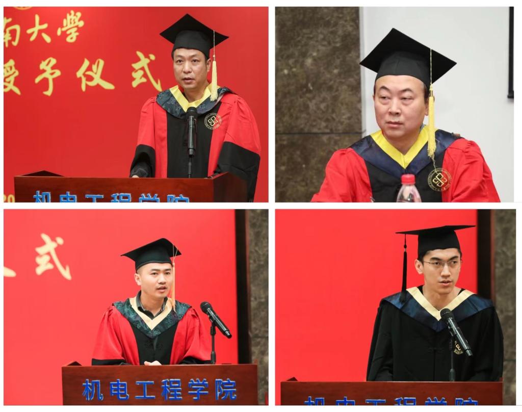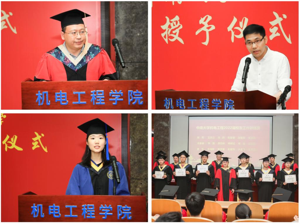上午8时30分,本科生毕业典礼暨学位授予仪式正式开始。全体师生齐唱国歌后,副院长云忠宣读学位授予决定。本科毕业生代表肖灿城发言,他回顾了在校求学和成长经历,表达了对母校母院、恩师同窗、父母亲友的感激之情。教师代表罗志回忆了师生共处的美好时光,并勉励毕业生知行合一、经世致用,在今后的人生道路上怀揣理想,勇于探索,早日达成奋斗目标。