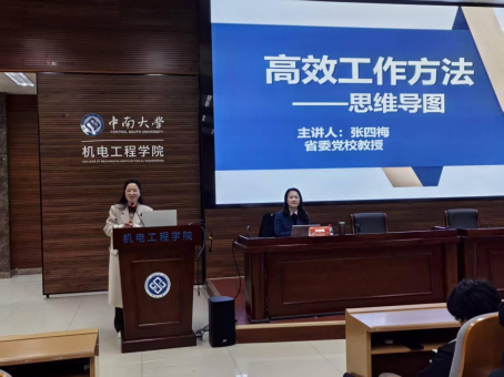 本期人文讲堂邀请到湖南省委宣讲团成员、硕士生导师张四梅教授作为主讲人,进行“高效工作方法——思维导图”专题讲授。机电工程学院党委副书记李玲芝老师主持,300余名师生参与学习。
